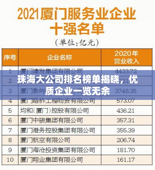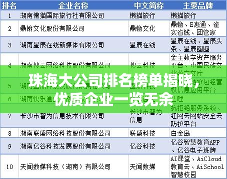 珠海,这座美丽的海滨城市,以其得天独厚的地理优势和日益发展的经济面貌吸引了众多企业的目光,众多大公司在这里扎根,为珠海的繁荣注入了源源不断的活力,本文将为您介绍珠海好的大公司排名,带您领略这些企业的风采。