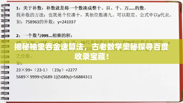 袖里吞金速算法作为一种古老的数学算法,仍然具有一定的实用价值和研究意义,通过百度等搜索引擎,我们可以轻松找到相关资源和信息,学习这种神秘的速算法,希望本文能为大家揭开袖里吞金速算法的神秘面纱,激发大家对古代数学文化的兴趣。